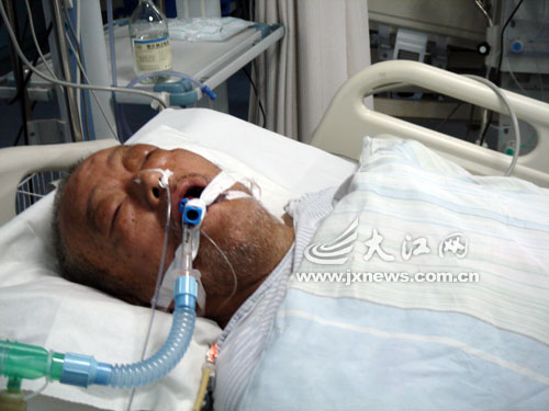 終于,老人被救上岸,由120急救車送往南昌市第三醫(yī)院。記者來到醫(yī)院重癥監(jiān)護(hù)室看到,老人年約70歲。醫(yī)護(hù)人員說,被送來時,老人已昏迷,經(jīng)急救已能睜開眼睛,但仍未脫離危險,要靠呼吸機(jī)輔助呼吸。