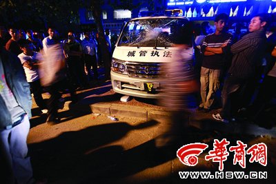 西安十余名城管圍毆商戶 群眾掀翻執法車(圖)