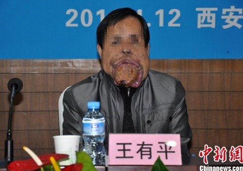 據了解,患者王有平,34歲,自出生后即被父母發現嘴唇發青,哭鬧時略腫大,左耳前區略隆起、發脹。6歲時,患者上下嘴唇、左面部明顯腫大。從 13歲起舌體體積增大,往外伸長,直至不能像正常人那樣合嘴。由于患病,王有平口齒不清,不能正常飲食,呼吸困難,其面容經常引起路人的歧視。2000年在北京求醫時,舌頭一度出血達4000多毫升,危及生命。