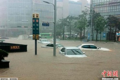 韓國首爾、京畿、江原、釜山和慶南等地區(qū)從7月26日下午起降下百年一見的強(qiáng)降雨,造成多起泥石流、交通阻塞、停電、街道和住宅區(qū)淹水。