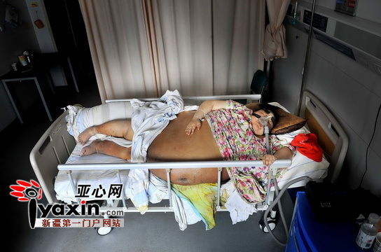 2月5日,蘭州軍區烏魯木齊總醫院的心血管內科,已經無法動彈的楊麗娟帶著呼吸機側躺在病床上。由于體重太重,長期臥床,楊麗娟身上有大面積褥瘡。其丈夫韓鐵柱說,每2天給她換一次藥,換藥時,6個男醫生合力才能將她抬起來再放平到另一張床上。