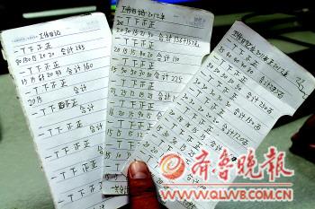 26日,記者在泰安市泰山區(qū)迎勝派出所見到了這本“工作日記”,第一行寫著“工作日記 2011-2012”,下面每一行分筆畫寫出一個(gè)“正”字。一行代表偷了五輛自行車,每個(gè)字下方標(biāo)記著“15、21、30、80、150”等數(shù)字,分別代表銷贓一輛車賣出的價(jià)格,最后一行是每月銷贓收入的總計(jì)。其中有幾行“正”字,是楊某準(zhǔn)備要偷還沒來得及下手的。