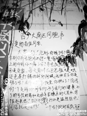 “學生們的不滿,是從這學期開學漲價開始的,而且最近菜飯分量更少了,并且收費混亂,同學們決定集體抗議不去食堂。”學生小林說,3月29日,學生們自發組織不去食堂吃飯,并在食堂門口貼了倡議書,還在宿舍之間互發傳單。記者看小林拍攝的倡議書照片,上面寫著:“此刻,你餓了吧?這學期你在食堂有吃過一餐飽飯嗎食堂的價錢你心痛嗎?總是打錯價格的阿姨,這種日子你受夠了嗎?為了那可憐的胃和父母辛苦賺來的人民幣,團結起來吧……”學生們表示,這學期食堂換了新老板,所以漲價。