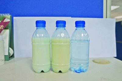 記者取出50毫升家磨豆?jié){,加入10克豆?jié){香精粉末和500毫升純凈水,配成“香豆?jié){”。和家磨豆?jié){相比,兩者顏色近似,裝在同樣的藍色礦泉水瓶中幾乎難辨真假,唯一區(qū)別是家磨豆?jié){表面的泡沫較多。但“香豆?jié){”的香味遠比家磨豆?jié){足,打開蓋子就香氣撲鼻。