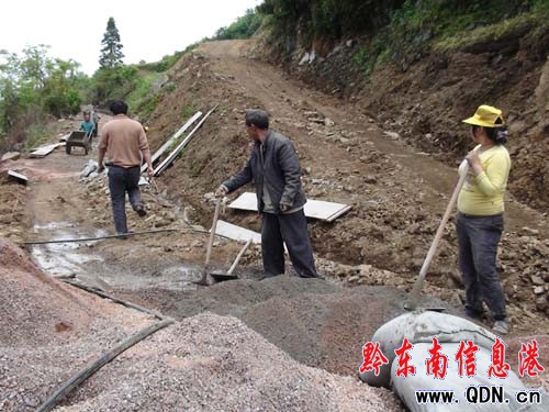 大河村近年由于基礎設施建設,原有的引水渠多處損壞,嚴重影響村民引水打田及后續的灌溉。5月4日,該鄉鄉長張樂輝一行實地深入大河村查看水渠維修進度。在黃毛坪組,工人們正在清理溝渠,攪拌沙槳硬化溝渠,被尚寨至大地公路截斷的引水渠三天后又將灌溉稻田。在川巖組背后坡上,機器聲一片轟鳴,工人們正在拌沙槳、運輸、澆筑、振動、挾盒子,一條嶄新的水泥溝渠正向村民的稻田延伸開去。通過與工人交談了解,溝渠每天將向前推進50米,300多米的溝渠一個星期之內將完工,將確保川巖屋后坡100多畝稻田有水打田,確保秋糧穩產豐產。